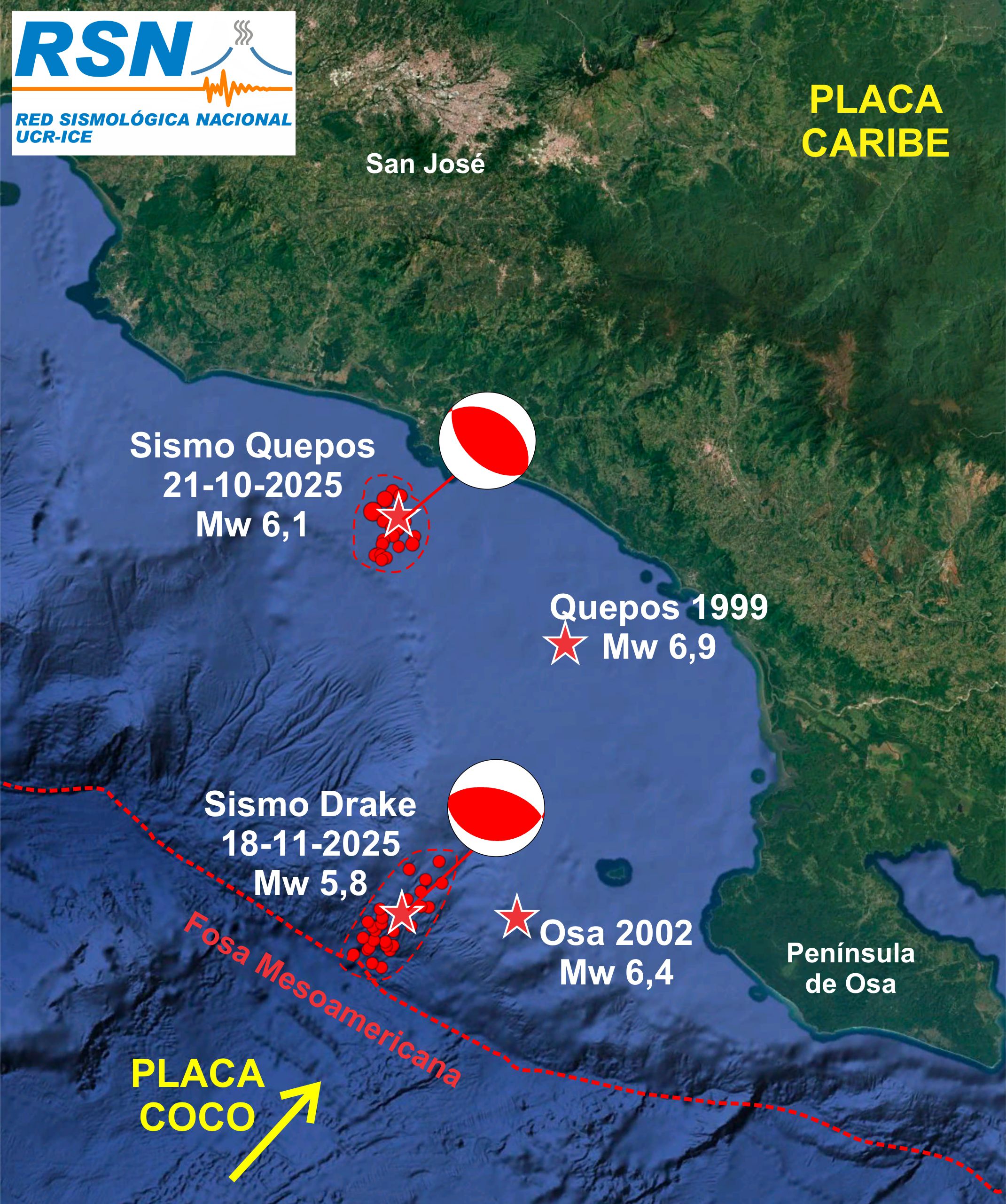En el mapa que acompaña esta publicación también muestra que esta actividad se ubica 70 km al sur de la secuencia reciente de octubre del 2025, cuando un sismo de Mw 6,1 ocurrió cerca de Quepos y fue sentido fuerte por su cercanía a tierra. Este sismo también tuvo un mecanismo focal inverso. En esta región también han ocurrido otros sismos importantes, como Quepos 1999 (Mw 6,9) y Osa 2002 (Mw 6,4), lo que evidencia la frecuencia de sismos significativos en esta zona del país.